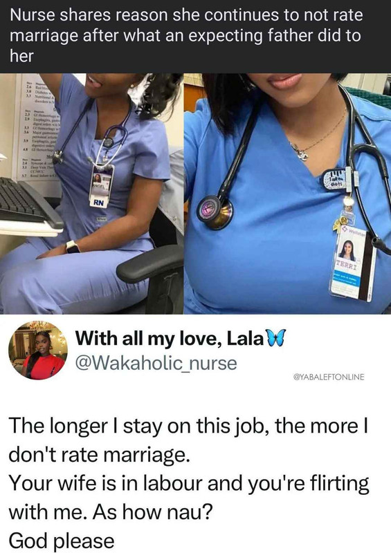 The nurse, who is popularly known on social media as “With all my love, Lala” with the handle @Wakaholic_nurse, narrated that the incident happened while a woman was in the labour ward, battling through childbirth. According to her, instead of the husband staying focused on his wife, he chose to flirt with her, a medical professional on duty.